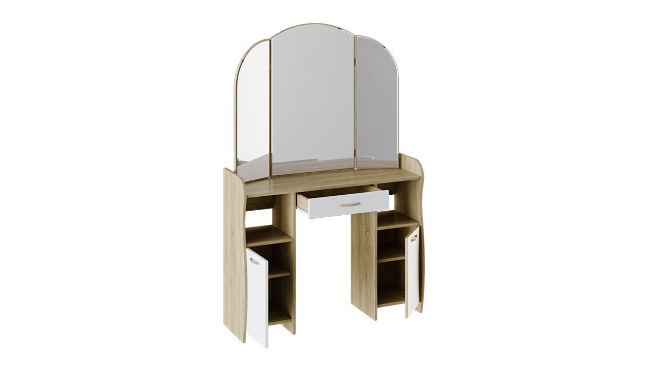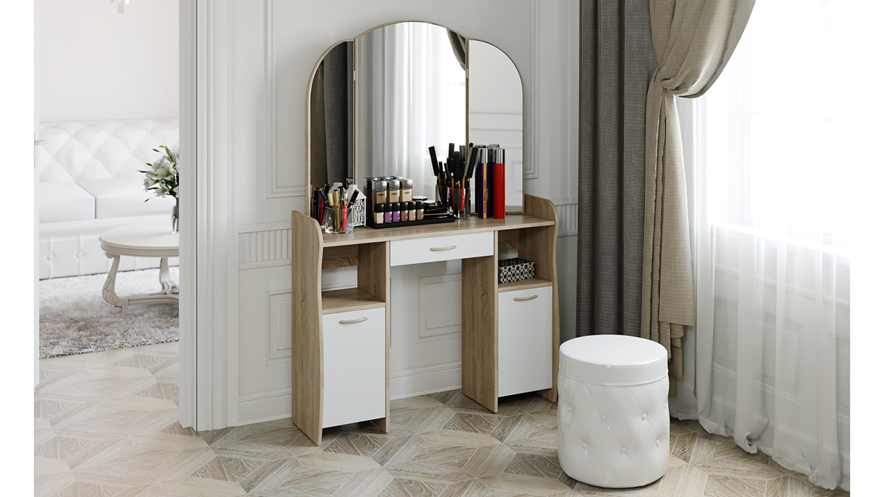 Лаконично простой и элегантный туалетный столик обладает не только эстетичным видом, но и достойной практичностью. Модель отличается эргономичной конструкцией и элегантной формой деталей. Вместительный ящик, столешница, большое зеркало и полки расположены на удобном уровне. Использование двух цветов в дизайне модели делает её оригинальной и позволяет использовать в любом интерьере.